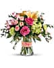 Go ahead, make them blush! This luxurious bouquet of roses, lilies and hydrangea in fresh shades of pink, peach and green is sure to put some cheerful color in their cheeks! The delicate ribbons dress up the graceful keepsake vase.