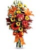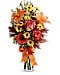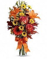 A burst of beauteous blooms in autumn shades of orange and yellow is mixed with a handful of oak leaves, then delivered in a clear glass vase adorned with a bright satin ribbon. A splendid gift for birthdays or any fall occasion.