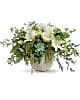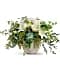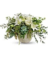 Bring flourishing beauty to any occasion with this naturally elegant arrangement of fresh white flowers, fresh succulents and delicate greens. The wildly chic arrangement is presented to perfection in a charming weathered pot.