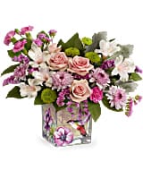 Sweet as a hummingbird flitting through a garden, this pretty pink rose bouquet looks lovely in a vintage-inspired cube vase.
