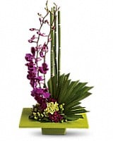 It's artistic arrangements like this one that make flowers such an integral and beautiful ingredient in feng shui. A brilliant green container and exotic palm leaf provide the perfect backdrop for purple orchids and a mix of delightful tropical flowers. This gift takes artistry to new heights.