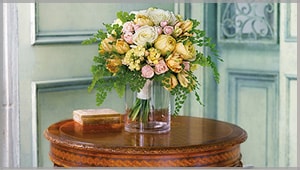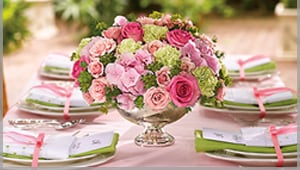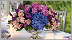 Pink flowers range from pale Asiatic lilies to vibrant hot pink gerberas and create a feeling of peace and harmony. A wedding table centerpiece might mix pink stock, larkspur and lisianthus with hot pink and light pink roses.